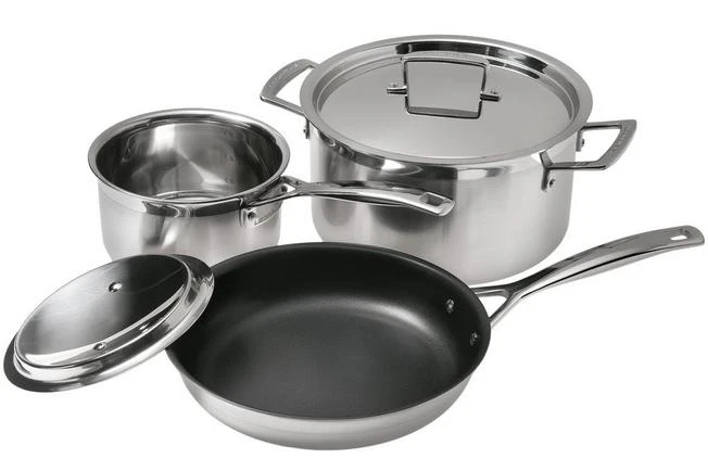 This 3-piece Le Creuset pan set is comprised of a cooking pot, a sauce pan and a frying pan. These pans can be used on all heat sources, including induction. They can also handle an oven up to 260 degrees. They are dishwasher proof. You can easily store the pans, because you can stack them.