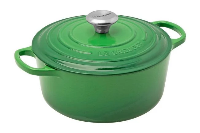This green Le Creuset cocotte from the Signature series is made from solid cast iron. A decent, top-quality pan that will last for generations. You can do a lot with this cast-iron pan. Cooking, frying and stewing on all types of cooking hobs. This pan can also be used in the oven, over an open fire or even in a wood-fired oven. You can even prepare cakes in this enamel pan. The pan is also great for keeping dishes cool in the fridge or freezer. You could also use it as a serving dish on a hot summer’s day, for example.