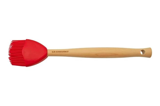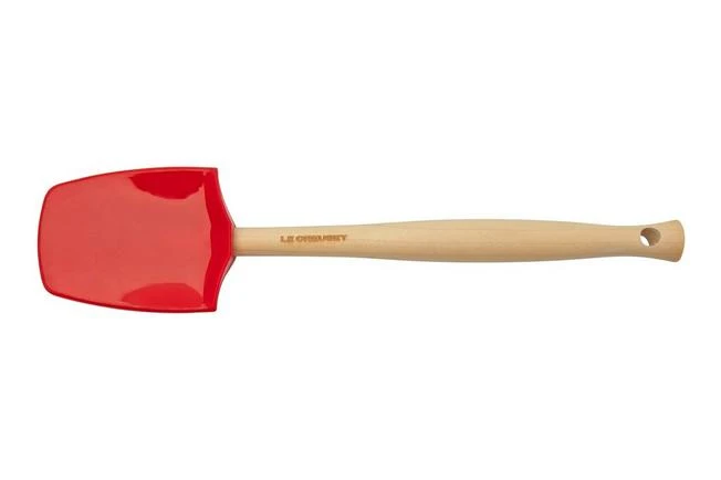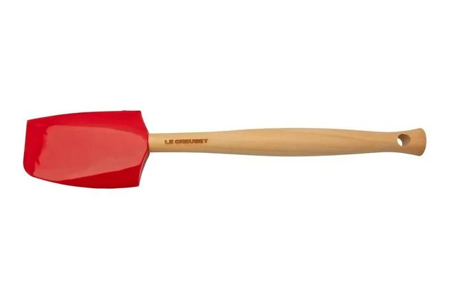 These three Le Creuset Premium sillicone spatulas cherry red are suitable for all types of pans. This sillicone is heat-resistant up to 205°C. , and it does not scratch non-stick coatings, polished surfaces or enamelled pans. The sillicone heads are removable, so you can put them in the dishwasher. The wooden handles are not dishwasher safe. Clean and dry these by hand.