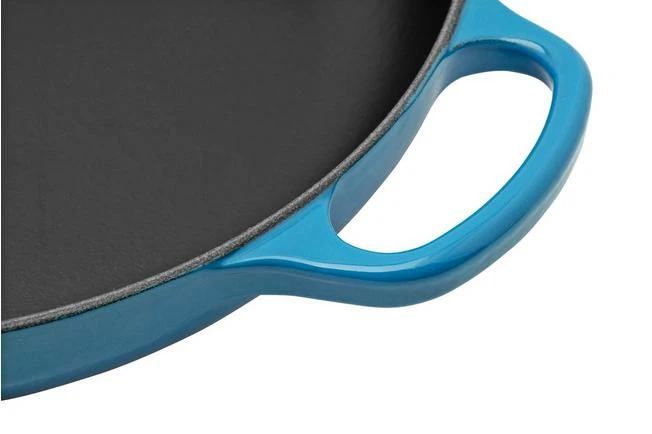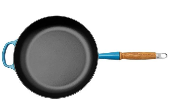 This Le Creuset frying pan azure from the Signature series is made from solid cast iron. A decent, top-quality pan that will last for generations. You can do a lot with this cast-iron pan. Cooking, frying and stewing on all types of cooking hobs. Because of the wooden handles, you cannot use this pan in the oven or dishwasher.