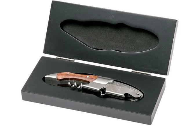 The Le Creuset WT-110 is a beautiful and complete waiter’s corkscrew enhanced with a double lever. This means that you remove the cork in two steps. Say goodbye to broken corks. A spring has been added to the lever to make sure it is very easy to use. On the back of the lever you will find a bottle opener for those rare individuals who prefer another type of drink. The steel handle has been adorned with a stunning piece of wood and on the side you will find a foil cutter you can use to remove the foil that protects the cork when it is ageing in your cellar.
